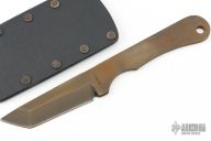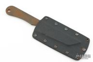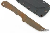 This knife by Ricky Fowler features a black blade with notched thumb rest, .125" blade stock and 1.003" blade depth, full tang construction with skeletonized handle. Comes with a kydex sheath. Has a couple light scuffs and broken tip, some rusting, otherwise fair condition. Could use some TLC. #1138