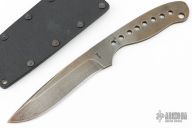 This knife by Ricky Fowler features a darkened and satin finished blade with .125" blade stock and 1.003" blade depth, full tang construction with skeletonized handle. Comes with a kydex sheath. Has a couple light scuffs some rusting and a blunted tip, otherwise fair condition.