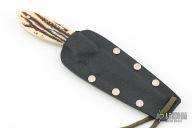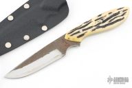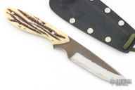 This neck knife by Master Smith Murray Carter features a satin finished San Mai blade with hammermarked flats, .121" blade thickness and .946" blade depth, full tapered tang construction. The handle has stag scales with nickel silver and mosaic pins. Comes with kydex neck sheath. Has scratches and oxidation spots on the flats. Great condition otherwise.