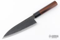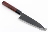 The blade is Stainless Clad Aogami Super Steel (NAS) which is a high-carbon steel alloy with vanadium. As with all of Takeda's knives, it has a strong sharp edge. The octagon shaped wood handle is easy to hold. 169mm cutting edge, .113" blade stock and 1.795" blade depth, hidden tang construction. Comes with original box and papers. Brand new from maker!