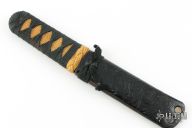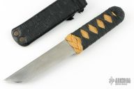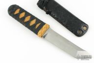 This Kwaiken by Phill Hartsfield features a satin finished chisel ground tanto blade, .258" blade stock and 1.250" blade depth, hidden tang construction. The handle has epoxied cord wrap over yellwo cord. Comes with a paper lined, black leather covered metal scabbard. Excellent condition.