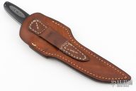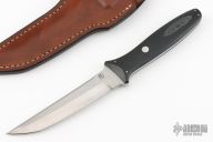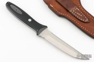 This Tanto by Bob Lum features a hand rub satin finished upswept tanto blade with .178" blade stock and 1.004" blade depth, full tapered tang construction. The handle has black G-10 scales with stainless pins. Comes with original sheath and zipper case. Excellent condition.