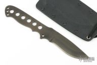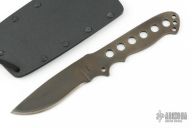 This knife by Ricky Fowler features a black blade with notched thumbrest, .125" blade stock and 1.109" blade depth, full tang construction. Comes with a kydex sheath. Has some sheathing marks otherwise the knife is in excellent condition.