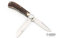 This slipjoint folder by Mike Zscherny features two hand rub satin finished blades with nail nicks. The handle has fluted polished stainless bolsters, stag covers, stainless steel liners and springs. Half stop on blades, lockups are flush open/closed/halfstop. Perfect function. Comes with a zipper case. Excellent condition.