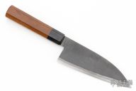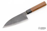 The Debabocho is a heavy knife traditionally used for filleting fish. The blade is Stainless Clad Aogami Super Steel (NAS) which is a high-carbon steel alloy with vanadium and is ground on both sides. As with all of Takeda's knives, it has a strong sharp edge. The octagon shaped wood handle is easy to hold. 160 mm cutting edge, .255" blade stock and 2.098" blade depth. Brand new from maker. Comes with original box.