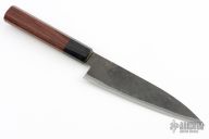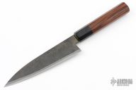 The Petit knife is traditionally used as a paring knife or all-purpose small kitchen knife. The blade is Stainless Clad Aogami Super Steel (NAS) which is a high-carbon steel alloy with vanadium. As with all of Takeda's knives, it has a strong sharp edge. The octagon shaped wood handle is easy to hold. 150mm cutting edge, .110" blade stock and 1.425" blade depth, hidden tang construction. Comes with original box and papers. New from maker.