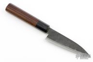 The Mini Petit knife is traditionally used as a paring knife or all-purpose small kitchen knife. The blade is Stainless Clad Aogami Super Steel (NAS) which is a high-carbon steel alloy with vanadium. As with all of Takeda's knives, it has a strong sharp edge. The octagon shaped wood handle is easy to hold. 114mm cutting edge, .064" blade stock and 1.244" blade depth, hidden tang construction. Comes with original box and papers. New from maker.
