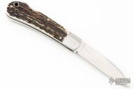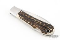 This Zulu Spear by Mike Zscherny features a spear point blade with a hand rubbed satin finish and nail nick. The handle has a fluted stainless steel bolsters, stag covers, stainless steel liners and springs. Comes with a zipper case. Excellent Condition.