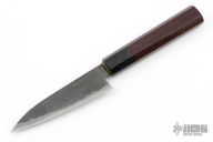 The Mini Petit knife is traditionally used as a paring knife or all-purpose small kitchen knife. The blade is Stainless Clad Aogami Super Steel (NAS) which is a high-carbon steel alloy with vanadium. As with all of Takeda's knives, it has a strong sharp edge. The octagon shaped wood handle is easy to hold. 111mm cutting edge, .080" blade stock and 1.172" blade depth, hidden tang construction. Comes with original box and papers. New from maker.