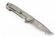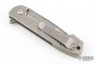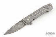 This Kumu by Defiant 7 features a dark tumble finished blade with flipper. The handle has a stonewashed titanium frame with matching backspacer and tip up clip. Rides on bearings, nice detent, lockup and blade seating. Comes with a zippered case. Excellent condition.