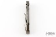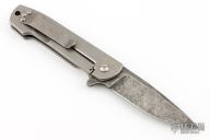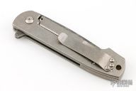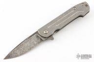 This Kumu by Defiant 7 features a dark tumble finished blade with flipper. The handle has a stonewashed titanium frame with matching backspacer and tip up clip. Rides on bearings, nice detent, lockup and blade seating. Comes with a zippered case. Excellent condition.