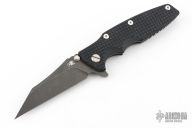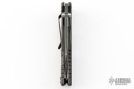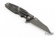 This Eklipse Flipper by Rick Hinderer Knives features a 3.5" battle black DLC finished blade, notched thumbrest and flipper, dual thumbstuds. The handle has a black MEFP G-10 scale, and battle black titanium handle/clip. Clip can be mounted for tip up or down carry. Nice lockup, seating, and detent. Comes with original box and extra washers. Has a couple light scuffs, otherwise Excellent condition.