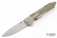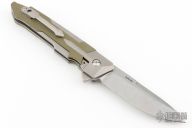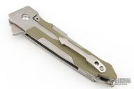 The Handle: The handle is a long, ergonomic, "Kwaiken-like" profile built from solid titanium with 3D machined horizontal texture on the outside and herringbone on the inside. Both titanium slabs are inlaid with smooth, green G10 in the "Spartan Helmet" design. Lock operation is solid and smooth and over travel prevention through the clever use of the inlay. A small titanium backspacer offers a generous lanyard loop attachment.
