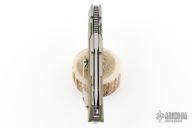 The Blade: Traditional spear point style CPM-S35VN stainless steel blade has fine heavy stonewash finish that helps to reduce reflectivity and hide wear. It's given a primary flat bevel along with a tapered top edge accent. A long stretch of jimping on the spine provides solid traction in the hand. The blade deploys on a dual ball bearings pivot system fast and smooth via the index flipper that provides a solid index finger guard in the open position.