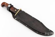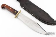 This W49 Bowie by Western Cutlery features a satin finished blade with a nearly sharpened top edge, .170" blade stock and 2.070" blade depth, full tang construction. The handle has a brass guard that has been cut down, laminated rosewood scales with brass pins. Comes with a black leather sheath. Has some light scratches and pitting, otherwise good condition. The consigner said that it was "Modified Per Bill Bagwell Specs"