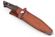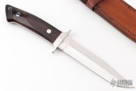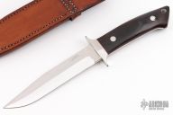 This Loveless Style Fighter by Neill Schutte features a mirror polished blade with partially sharpened top edge, .179" blade stock and 1.101" blade depth, full tapered tang construction. The handle has a 303 stainless steel guard, African Blackwood scales with red liners. Comes with a brown leather sheath. Excellent condition.
