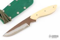 This neck knife by Murray Carter features a laminated blade with satin grinds, forged finished flats and a tang construction, .108" blade stock and .939" blade depth. The handle has mammoth ivory scales. Includes a kydex neck sheath. Has some scratches otherwise the knife is in excellent condition.