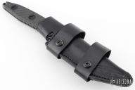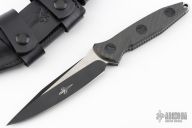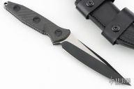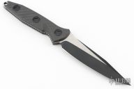 This knife features a two-tone blade with satin flats and black ceramic coated grinds, clip point, notched thumb-rest. .2" blade stock and 1.138" blade depth, full tang construction. The handle has carbon fiber scales. The tang is notched all around and there is a lanyard hole at the butt. Comes with a black leather sheath and Microtech box. Excellent condition.