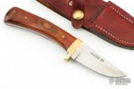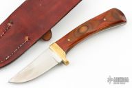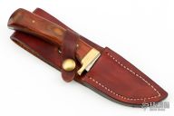 This knife features a mirror polished blade with .153" blade stock and 1.031" blade depth, full tang construction. The handle has a brass guard with wood scales and brass pins. Comes with a brown leather sheath. Excellent condition.