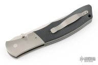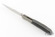 This linerlock from John W. Smith features a hand rub satin finished blade with a false top edge and dual thumbstuds. The handle has dovetailed bead blasted titanium bolsters, black G-10 scales, bead blasted titanium liners, tip up bead blasted titanium clip, black G-10 backspacer, and a lanyard hole at the butt. Nice detent, lockup and blade seating. Excellent condition. Comes with a velcro case.