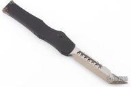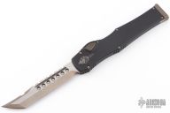 This Halo VI features a bronzed Hellhound tanto blade with satin flats, fullers and notched spine. Its handle is made from black Mil-Spec anodized alloy with bronzed hardware. The charging handle comes marked with the Microtech logo and date of creation along with the serial number. Microtech's Halo VI sets itself apart from previous models with added safety features and an improved charging handle mechanism. . Its upgraded charging handle is built with dual pivoting latches that create a secure seal in the closed position. Comes with original box, kydex sheath and papers. Dated 09/2018. Excellent condition.