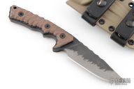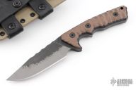 This M-27 by Miller Bros Blades features a drop point blade with .275" blade stock 1.340" blade depth, full tang construction. The handle has textured brown G-10 scales with black G-10 liners, lanyard hole, extended tang. Comes with a kydex/leather sheath. Comes with COA. Excellent condition.