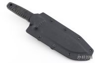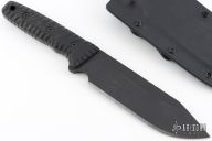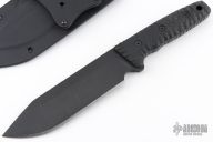 This Bowie by Miller Bros Blades features a black blade with nothced thumbrest, .320" blade stock 1.982" blade depth, full tang construction. The handle has textured black G-10 scales with lanyard hole. Comes with a kydex sheath. Has some light scratches and some light oxidation on the blade edge, otherwise excellent condition.
