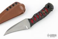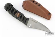 This knife by Joe Watson features a hawk bill hand rub satin finished blade with .156" blade stock and 1.530" blade depth, hidden tang construction. The handle has black cord wrap over a ray skin underlay, and also has copper embellishments. Comes with a kydex sheath. Has a couple light scuffs, excellent condition otherwise.