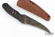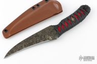 This knife by Joe Watson features a hawk bill blade with forced patina finish .167" blade stock and 1.612" blade depth, hidden tang construction. The handle has black cord wrap over a ray skin underlay, and also has brass embellishments. Comes with a kydex sheath. Has a couple light scuffs, excellent condition otherwise.