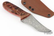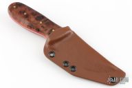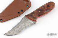 This fixed blade by Joe Watson features an acid etch finished recurve tanto blade with a false top edge, .180" blade stock and 1.77" blade depth, tapered tang construction. The handle has Amboya burl scales, brass pins and red liners. Comes with a kydex sheath, card and sticker. Has some light scuffs, excellent condition otherwise.