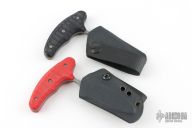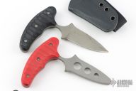 This Push Dagger by ShivWorks has a bead blast blade with a false top edge and black G10 handle, full tang construction, blade thickness of .187" and depth of 1.236". Kydex sheath. Has some oxidation on the blade and a few light scratches, otherwise great condition. Comes with matching trainer with red scales and a kydex sheath.