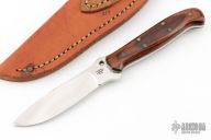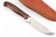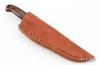 This knife by "KAP Forge" features a satin finished blade with mirror polished flats, .186" blade stock and .863" blade depth, full tapered tang construction. The handle has dymondwood scales with white liners. Comes with original brown leather sheath. #217-2 on the blade and 217 on the sheath. Has some light patina/oxidation on the tang and blade, otherwise good condition.