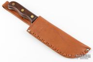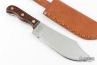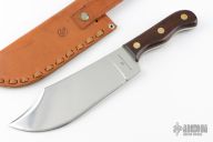 This Bowie was made by Hans Anderson for Abercrombie and Fitch. It has a satin finished blade with false top edge, .199" blade stock and 2.358" blade depth, full tang construction. The handle has rosewood scales with brass pins. Comes with a brown leather sheath. Has scratches, has been resharpened, otherwise good condition.