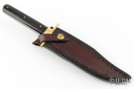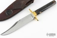 This bowie by Venture features a mirror polished blade with false top edge, .155" blade stock and 1.117" blade depth, full tapered tang construction. The handle has a brass guard and buffalo horn scales with brass pins. Comes with a hand tooled brown leather sheath by TreeStump leather. Has a couple light scratches and some light pitting on the blade, otherwise good condition.