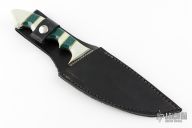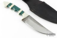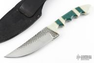 This Skinner by Anza Knives features a blade made from a file, multi-piece scales with brass spacers, .185" blade thickness and 1.719" blade depth, full tang construction. Comes with a black leather sheath. Has some scratches and patina, otherwise good condition. Dated '95