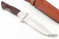 This knife by Robert Papp features a mirror polished clip point blade with satin finished flats and a sharpened top edge, .241" blade stock and 1.329" blade depth, full tapered tang construction. The handle has dovetailed stainless steel bolsters and rosewood scales. Comes with a Jim Layton leather sheath. Has some light scratches and staining, otherwise good condition.