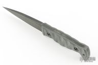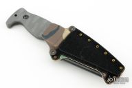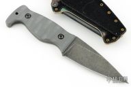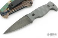 Has a stonewashed blade with .189" blade stock and 1.198" blade depth, full tang construction with gray G-10 scales. Comes with original sheath, box, and card. Has a couple light scuffs, excellent condition otherwise.