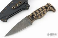Has a dark stonewashed blade with .189" blade stock and 1.198" blade depth, full tang construction with g10 scales. Comes with original sheath, box, and card. Has a couple light scuffs, excellent condition otherwise.