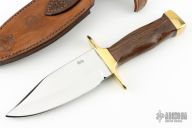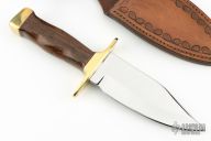 This bowie by Butch Taylor features a mirror polished blade with false top edge, .278" blade stock and 1.989" blade depth, hidden tang construction. The handle has a brass guard and butt, wood grip with red/black/white spacers. Comes with a hand tooled brown leather sheath. Has a couple light scratches, otherwise excellent condition.