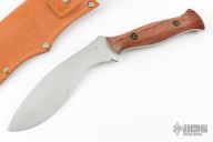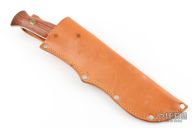 This knife by Larson Forge & Finish features a satin finished blade with .186" blade stock and 1.516" blade depth, full tang construction. The handle has wood scales. Comes with a brown leather sheath. Has a couple light scratches, otherwise excellent condition.