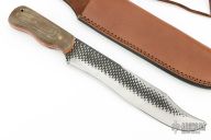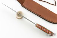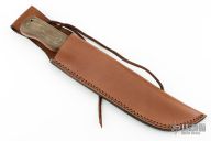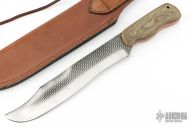 This knife by Don Seals features a satin finished blade with sharpened top edge, made from a farrier's rasp, .192" blade stock and 1.702" blade depth, full tang construction. The handle has green canvas micarta scales with orange G-10 liners, fileworked tang. Comes with a brown leather sheath. Has some light scratches and oxidation spots, otherwise good condition.