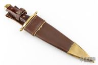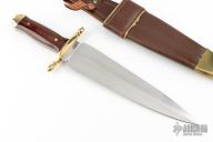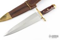 This Montero by Muela Knives feaures a satin finished double edged blade, .162" blade stock and 2.185" blade depth, full tang construction. The handle has a brass guard and butt with wood scales (ironwood?). Comes with brown leather sheath. Excellent condition.