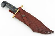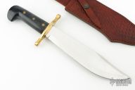 This vintage Bowie from Case Knives features a mirror polished clip point blade with false top edge, .171" blade stock and 2.016" blade depth, hidden tang construction. The handle is comprised of brass double guard with a black composite grip. Includes a brown leather sheath. Has a few light scratches and a couple of very small dings in the blade edge, otherwise excellent condition. Comes with original box and papers.