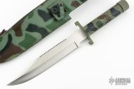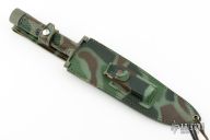 This vintage survival knife by Parker Brothers features a satin finished blade with false top edge and sawteeth on the spine, .161" blade stock and 1.390" blade depth, hidden tang construction. The handle has a camo aluminum handle and removable butt cap with hollow cavity filled with survival items. Comes with a camo leather sheath. Has some wear and scratches, otherwise good condition.
