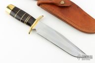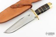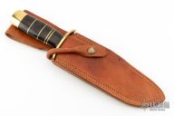 This knife by John Nelson Cooper features a satin finished blade with a false top edge, .211" blade stock and 1.840" blade depth, hidden tang construction. The handle has a brass guard and butt, brown canvas micarta grip with brass spacers. Has some scratches, otherwise excellent condition. Comes with a brown leather sheath.
