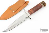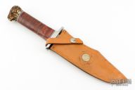This fighter features a satin finished blade with false top edge, .195" blade stock and 1.493" blade depth, hidden tang construction. The handle has a stainless steel guard, stacked leather grip and a stag butt, red/white/blue. Comes with a brown leather sheath with buffalo nickel inlays. Has some scratches, the butt is a little loose, otherwise good condition.