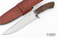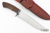 This Cuchillo Bowie by Luciano Torta features a hand rub satin finished blade with false top edge, .234" blade stock and 1.515" blade depth, hidden tang construction. The handle has a blued 1045 steel guard with a Wenge wood grip. Comes with a hand tooled brown leather sheath with matching frog. New from maker.