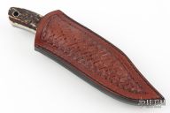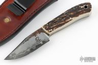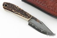 This Pocket Knife by Luciano Torta features a San Mai Damascus blade (420SS and 1095), false top edge, .190" blade stock and 1.005" blade depth, full tang construction. The handle has stag scales with stainless steel pins and lanyard hole. Comes with a hand tooled brown leather sheath with pocket clip. New from maker.