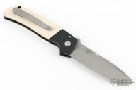 This ATCF Auto by Pro-Tech features a stonewashed Magnacut blade with notched thumbrest. The handle has a black aluminum frame with ivory paper micarta scales, tip up milled titanium clip with hidden screws. Comes with original box and papers. Excellent condition. First limited run 2022 #177