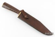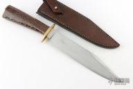 This Bowie by John Marlowe Smith features a hand rub satin finished clip point blade with a nearly sharpened top edge, .238" blade stock and 1.512" blade depth, hidden tang construction. Has a brass guard with a textured face, wenge wood grip, brass butt. Comes with brown leather sheath with belt loop. Has scratches and a few dings on the spine of the blade, otherwise good condition.